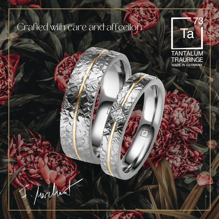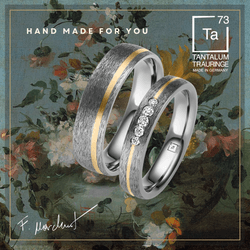 Mit unserer neuen Kollektion, basierend auf einem der seltensten Elemente unseres Sonnensystems - Tantal - verbinden wir schlichte, zurückhaltende Eleganz mit höchsten Ansprüchen an Langlebigkeit, Individualität und Wertigkeit. Das Element Tantal besitzt außergewöhnliche physikalische und chemische Eigenschaften. Es ist 5-mal härter als Platin, und mit einer Schmelztemperatur von 3000°C benötigt es, über das klassische Goldschmiedehandwerk hinausgehend, besondere Verarbeitungstechniken. Der einzigartige, anthrazit-dunkle Farbton macht das Metall unverkennbar. Das seltene Element ist aufgrund seiner Härte sehr oberflächenbeständig gegenüber den alltäglichen äußeren Einflüssen. In seiner Verwendung im Schmuckbereich ist Tantal zu 100% unbedenklich und hautverträglich, ein Grund weshalb es bislang überwiegend in der Medizin Verwendung findet. Im Hause Le Marchant, eine der wenigen deutschen Manufakturen für Schmuckhandwerk, nehmen wir uns der Herausforderung an, Tantal in einzigartige Schmuckstücke zu schmieden. Das Material ist ganz klar etwas Besonderes - selten, langlebig, edel. Aus diesem Grund nutzen wir Tantal für die Anfertigung von Verlobungs- und Trauringen.